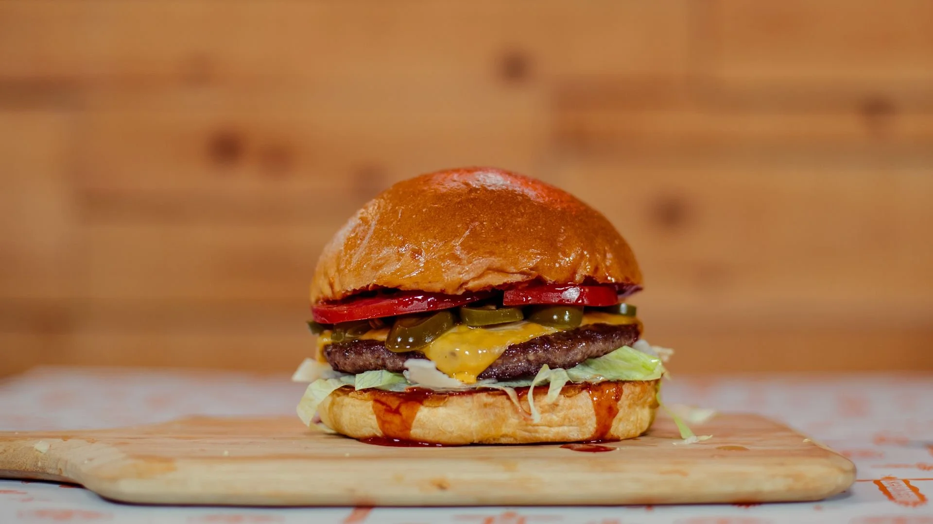 Juicy 150g beef patty, topped with cheddar cheese, fresh tomato, crisp iceberg lettuce and jalapeños, finished with chilli sauce in a soft brioche bun. Simple, spicy and satisfying